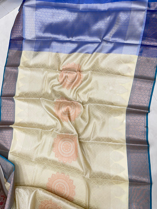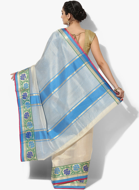 Faishana Presents Beige Resham Zari Stripe Brocade Contrast Blue Floral Zari Border Banarasi Saree
