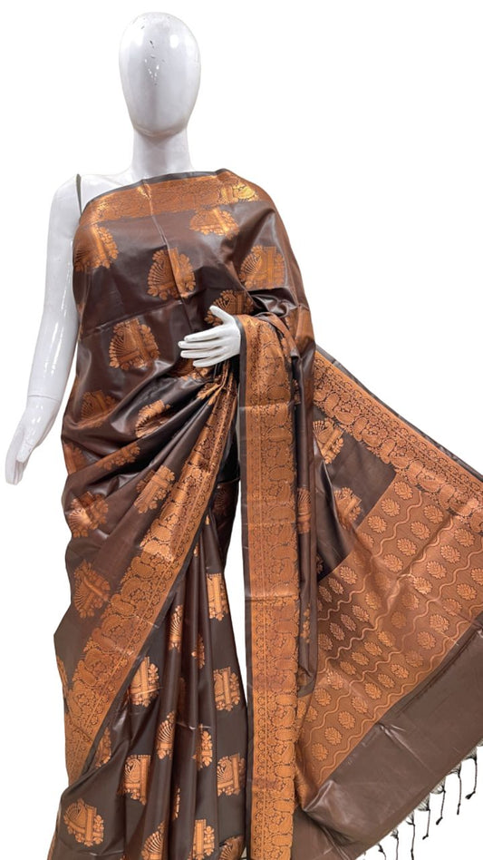 Faishana Presents Black Art Silk Copper Zari Floral Boota Contrast Copper Zari Border and Banarasi Pallu with Black Blouse