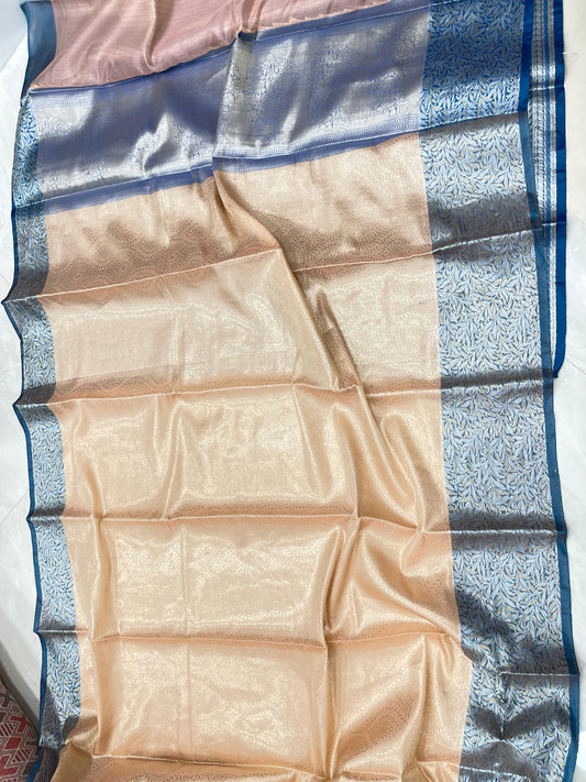 Faishana Presents Peach Art Silk Floral Lehariya Sliver Jaal with Contrast Blue Pallu and Olive Copper Silver Jaal Zari Border with Blue Blouse