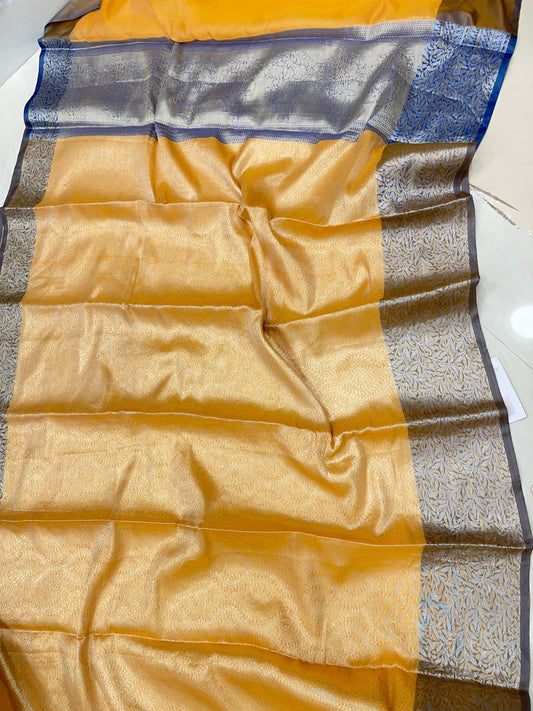 Faishana Presents Mustard Art Silk Floral Lehariya Sliver Jaal with Contrast Blue Pallu and Olive Copper Silver Jaal Zari Border with Blue Blouse