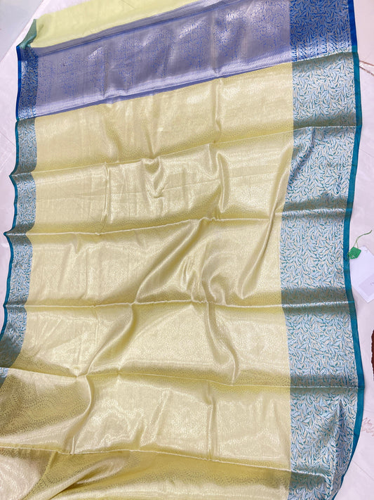 Faishana Presents LimeGreen Art Silk Floral Lehariya Sliver Jaal with Contrast Blue Pallu and Olive Copper Silver Jaal Zari Border with Blue Blouse