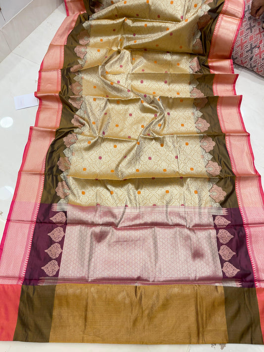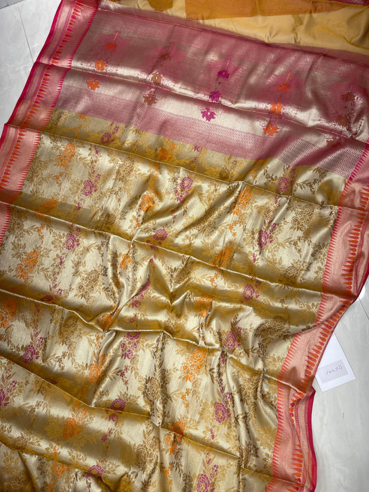 Faishana Presents Gold Art Silk Floral Tilfi Mina Zari Jaal with Contrast Pink Minakari Boota Pallu Double Mina Zari Border and Pink Blouse