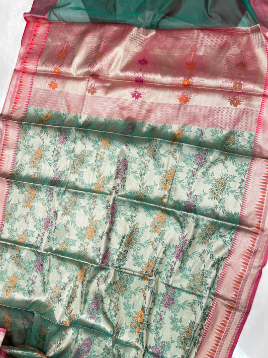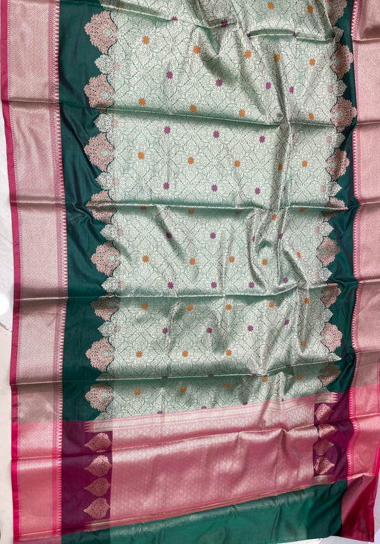 Faishana Presents Green Art Silk Floral Tilfi Mina Zari Jaal with Contrast Pink Minakari Boota Pallu Double Mina Zari Border and Pink Blouse