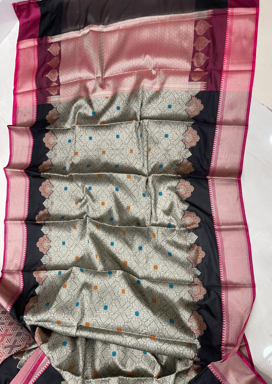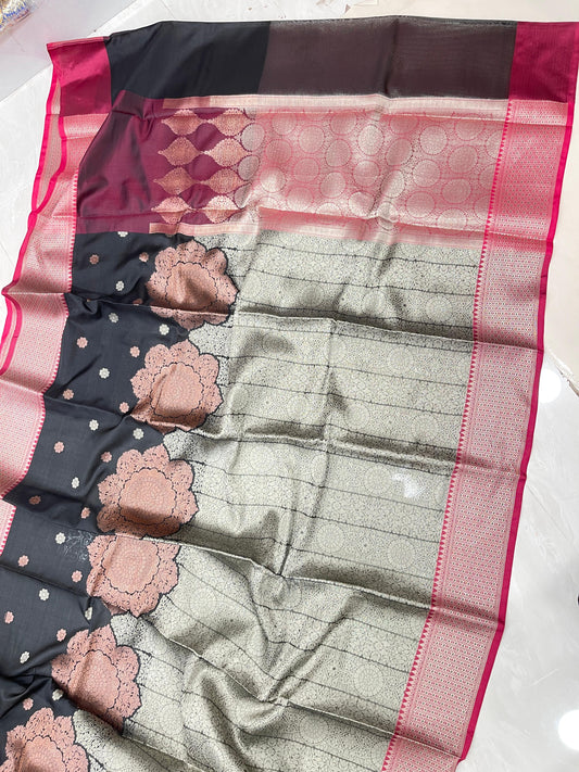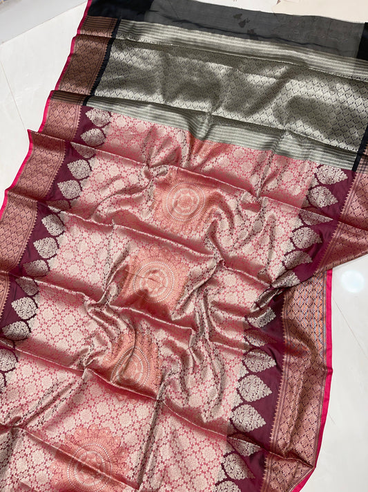 Faishana Presents Black Floral Stripe Diagonal Zari Mina Jaal and Copper and Silver Boota with Contrast Pink Pallu Banarasi Zari Border and Pink Blouse