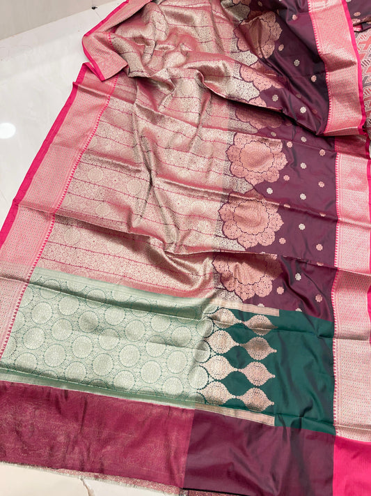 Faishana Presents Wine Floral Stripe Diagonal Zari Mina Jaal and Copper and Silver Boota with Contrast Green Pallu Banarasi Zari Border and Green Blouse