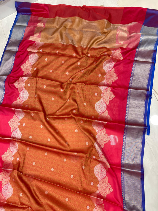 Faishana Presents Orange Floral Resham Zari Booti Contrast Blue Banarasi Border With Pink Banarasi Pallu And Orange Blouse