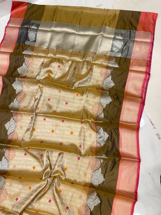 Faishana Presents Olive Green Floral Stripe Diagonal Zari Mina Jaal and Copper and Silver Boota with Contrast Maroon Pallu Banarasi Zari Border and Pink Blouse