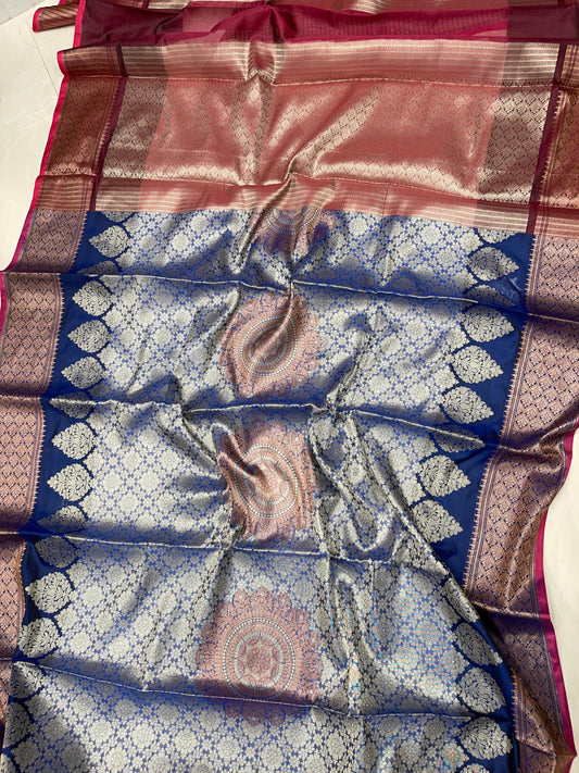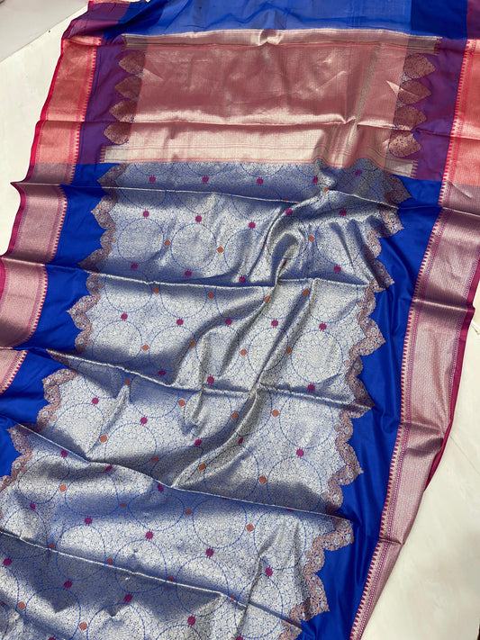 Faishana Presents Royal Blue Silver Zari Geometrical Mina Booti with Contrast Magenta Pallu Banarasi Zari Border and Magenta Blouse