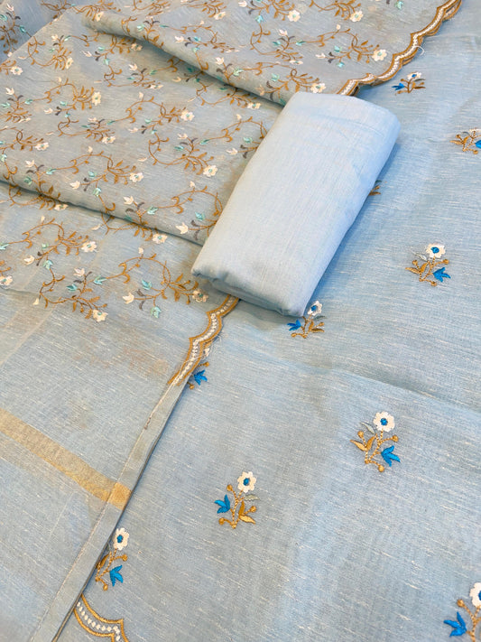 Light Blue Linen Silk Resham Booti Banarasi Suit with Embroidery Dupatta 11SKL_LNEM2