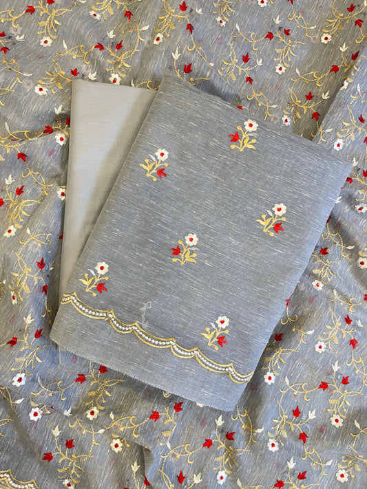 Grey Linen Silk Resham Booti Banarasi Suit with Embroidery Dupatta 11SKL_LNEM5