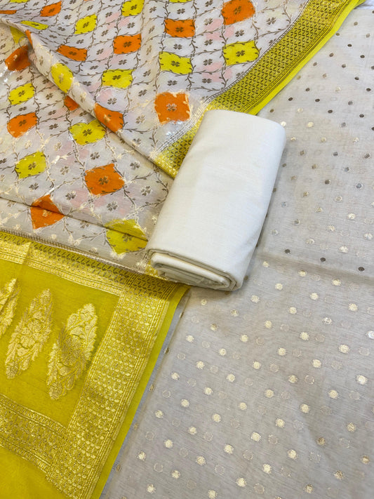 Off white Mercerise Silk Chunri Zari Booti Banarasi Suit with Rangkaat Dupatta 125SKL_MSRS5