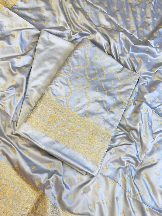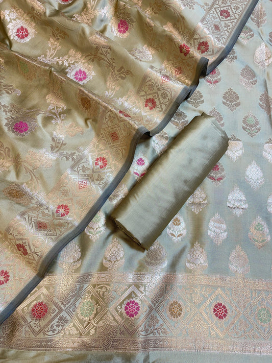 Grey Premium Handloom Mashru Silk Floral Zari Booti with Zari Jaal Dupatta Handloom Banarasi 3 pcs Suit Set 3000AJ_MSR13