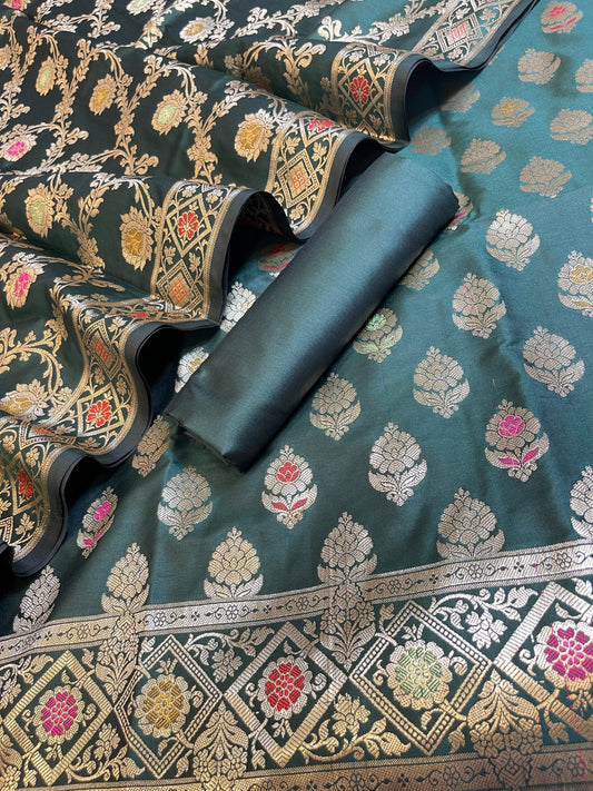 Dark Green Semi Silk Alfi Mina Zari Booti Minakari Banarasi Suit 1000AJ_SSLK4