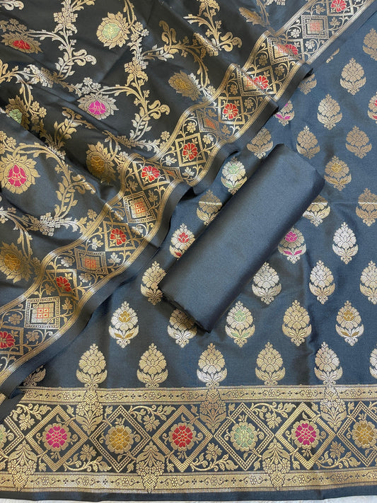 Grey Premium Handloom Mashru Silk Floral Zari Booti with Zari Jaal Dupatta Handloom Banarasi 3 pcs Suit Set 3000AJ_MSR15