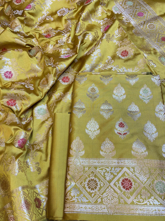 Tussar Premium Handloom Mashru Silk Floral Zari Booti with Zari Jaal Dupatta Handloom Banarasi 3 pcs Suit Set 3000AJ_MSR2