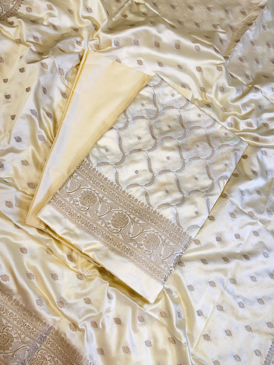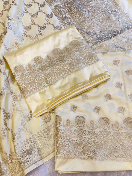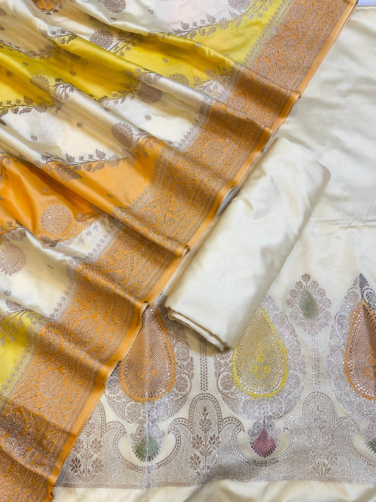 Cream Premium Handloom Mashru Silk Floral Zari Booti with Zari Jaal Dupatta Handloom Banarasi 3 pcs Suit Set 3000AJ_MSR11