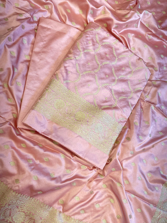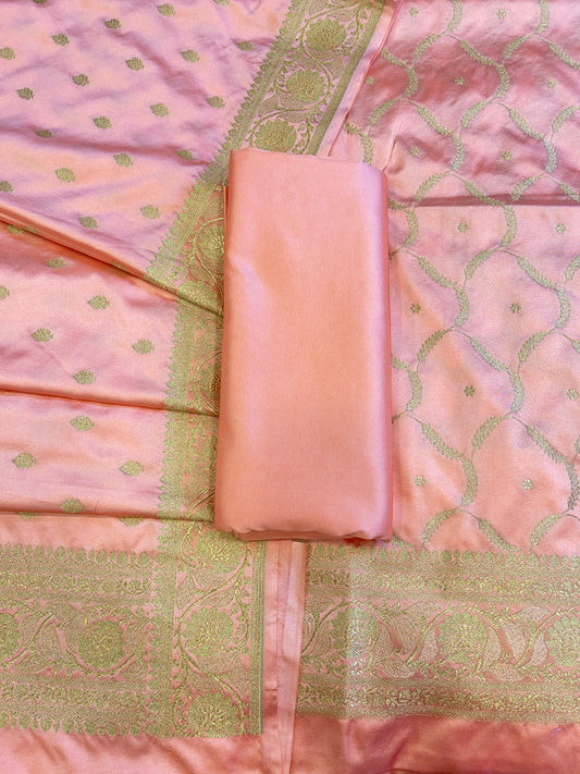 Peach Premium Handloom Mashru Silk Floral Zari Booti with Zari Jaal Dupatta Handloom Banarasi 3 pcs Suit Set 3000AJ_MSR10