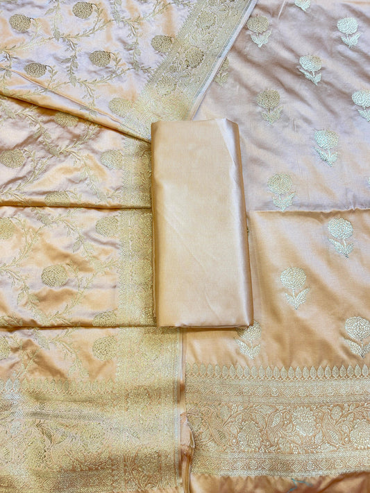 Peach Premium Handloom Mashru Silk Floral Zari Booti with Zari Jaal Dupatta Handloom Banarasi 3 pcs Suit Set 3000AJ_MSR20