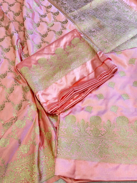 Peach Premium Handloom Mashru Silk Floral Zari Booti with Zari Jaal Dupatta Handloom Banarasi 3 pcs Suit Set 3000AJ_MSR1
