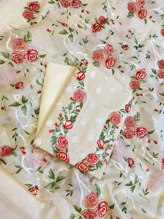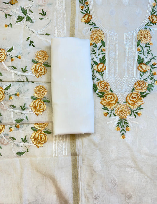 Off white Pure Mercerise Embroidery Necklace Banarasi 3 pcs Suit Set 12SKL_MN3