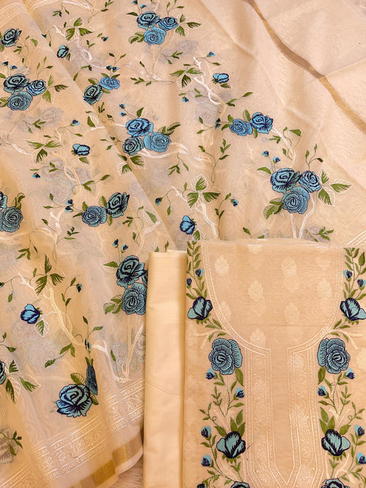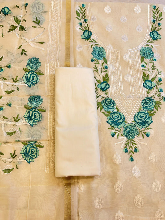 Cream Pure Mercerise Resham Zari Booti with Chanderi Silk Print Dupatta Banarasi 3 pcs Suit Set 1000SKL_PMC7
