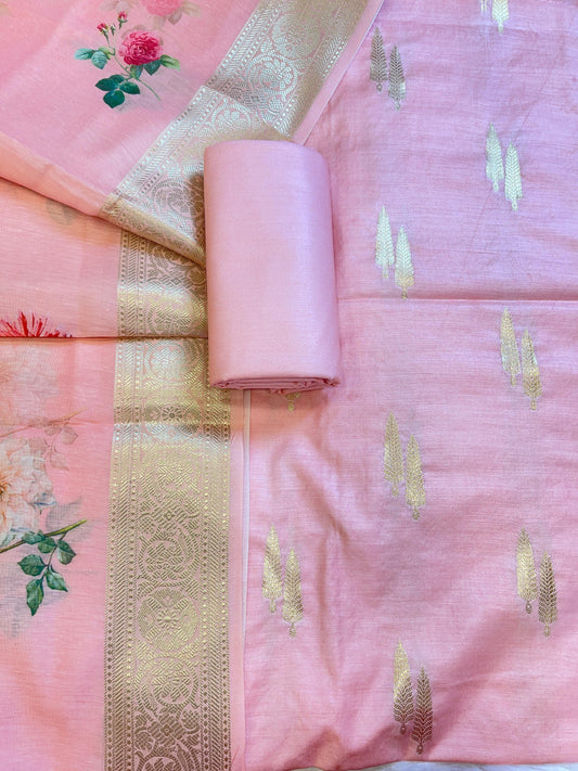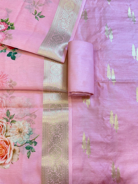 Pink Pure Mercerise Silk Floral Zari Dual Booti with Digital Print Dupatta Suit Set 1SKL_MP8