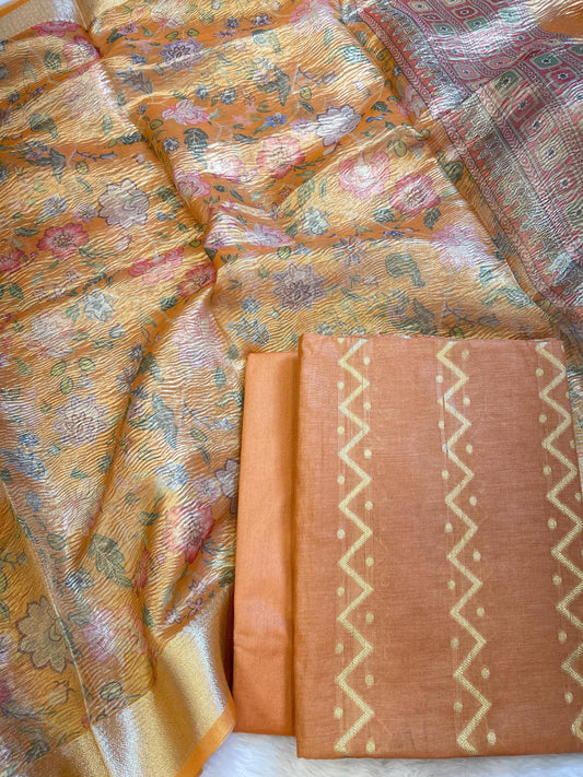 Light Orange Pure Mercerise Cotton Zig-Zag Zari with Crush Tissue Print Dupatta Suit Set 11SKL_MC1