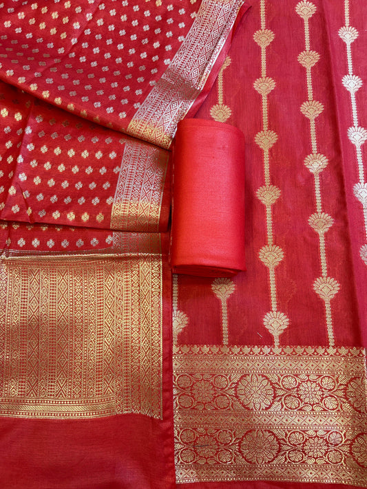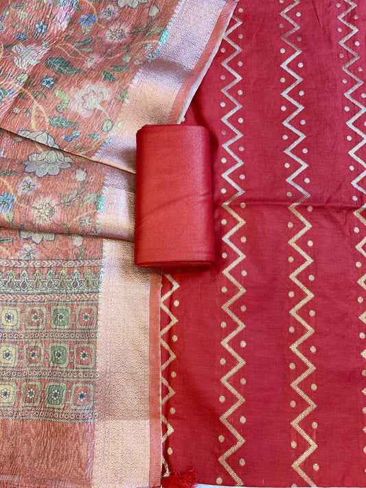 Red Mercerise Cotton Floral Stripe Zari with Chunri Booti Dupatta Banarasi Suit Set 1SKL_MC5