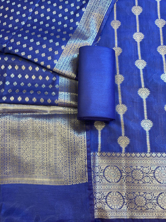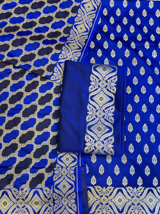 Pure Handloom Blue Mashru Silk Floral Zari Booti with Rangkaat Dupatta Banarasi 3 pcs Suit Set 26AJ_MSR9