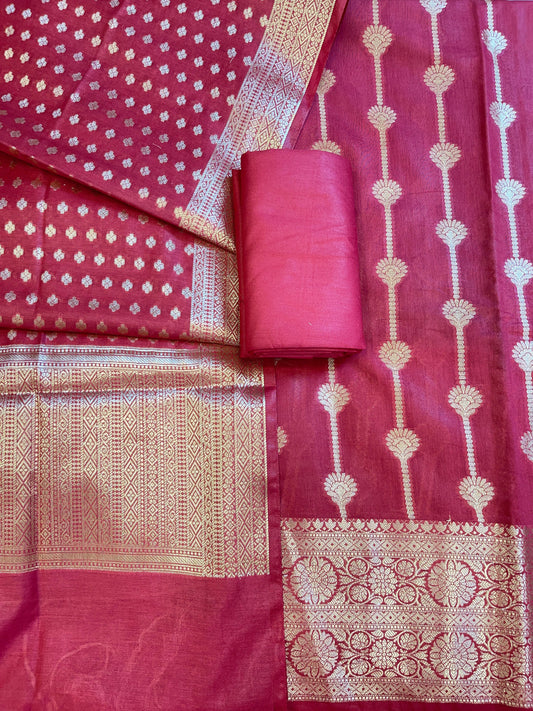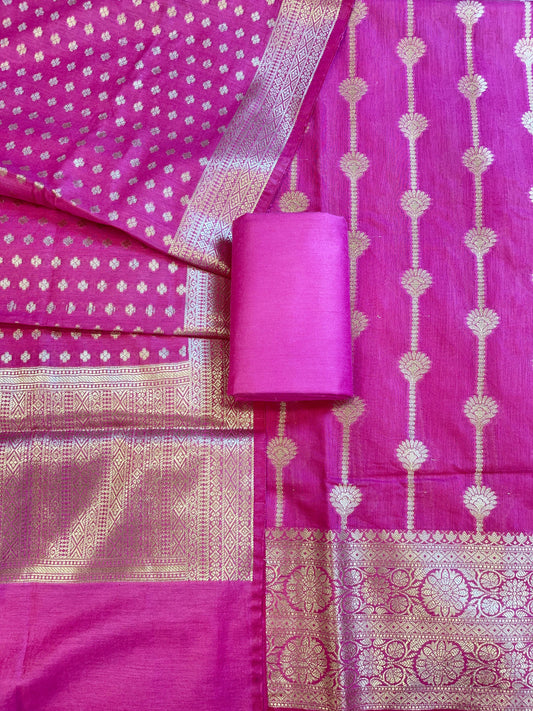 Dark Pink Mercerise Cotton Floral Stripe Zari with Chunri Booti Dupatta Banarasi Suit Set 1SKL_MC7