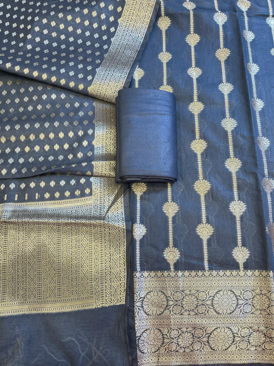 Navy Blue Mercerise Cotton Floral Stripe Zari with Chunri Booti Dupatta Banarasi Suit Set 1SKL_MC6
