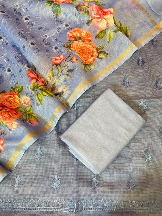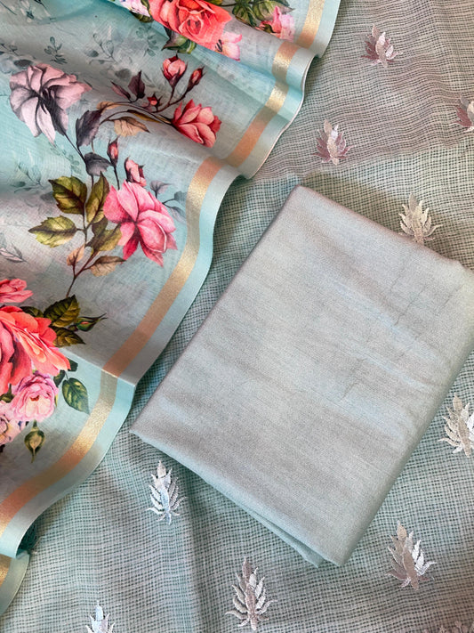 Light Blue Pure Mercerise Silk Floral Zari Dual Booti with Digital Print Dupatta Suit Set 1SKL_MP9