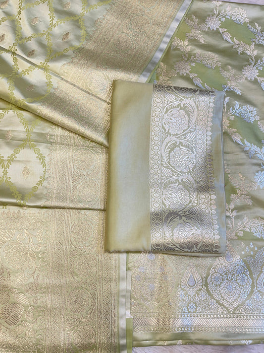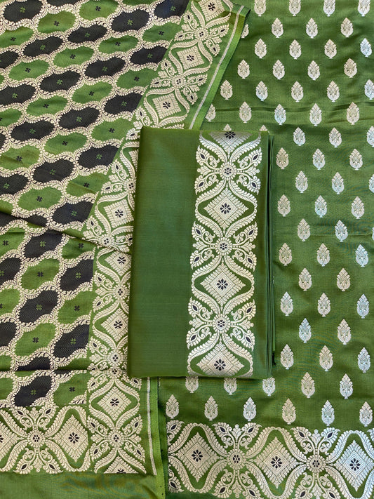 Pure Handloom Olive Green Mashru Silk Floral Rangkaat Floral Zari Jaal Banarasi 3 pcs Suit Set 26AJ_MSR6
