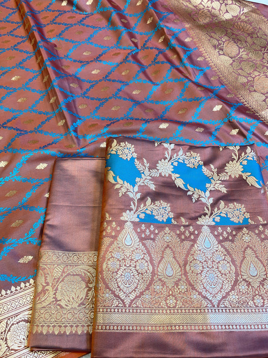 Pure Handloom Dark Brown Mashru Silk Floral Rangkaat Floral Zari Jaal Banarasi 3 pcs Suit Set 26AJ_MSR7