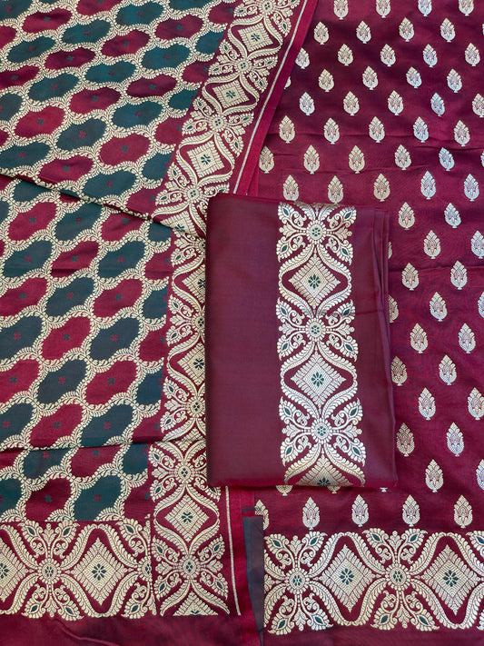 Pure Handloom Wine Mashru Silk Floral Zari Booti with Rangkaat Dupatta Banarasi 3 pcs Suit Set 26AJ_MSR10