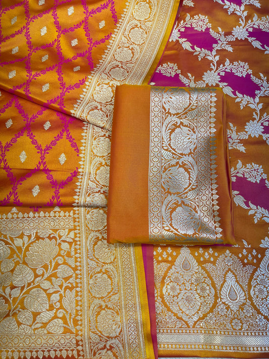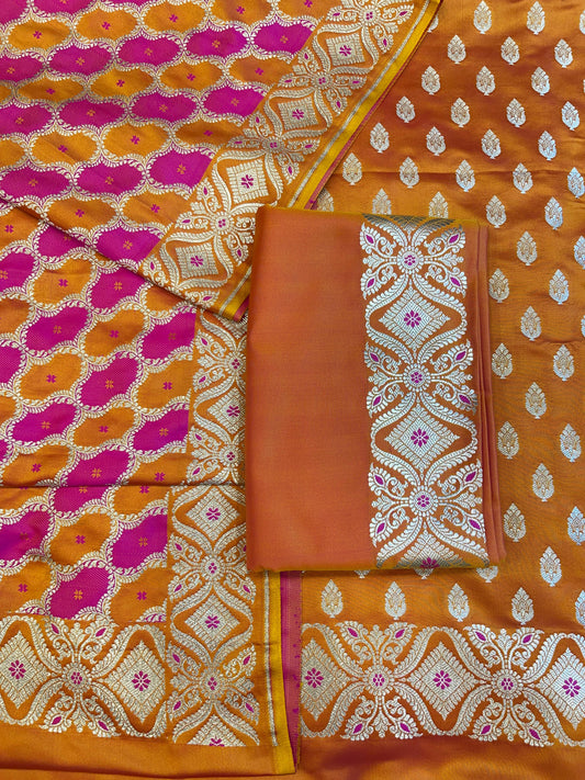 Pure Handloom Mustard Yellow Mashru Silk Floral Rangkaat Floral Zari Jaal Banarasi 3 pcs Suit Set 26AJ_MSR3