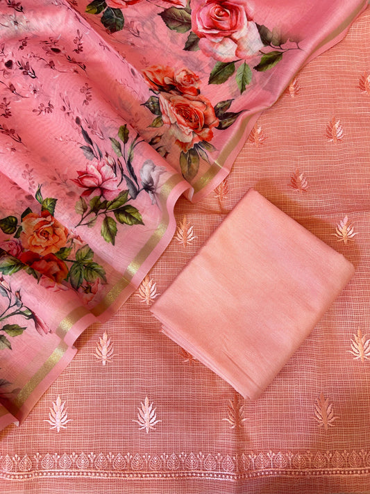 Peach Kota Check Resham Embroidery with Digital Print Dupatta Banarasi Suit Set 1SKL_KC14
