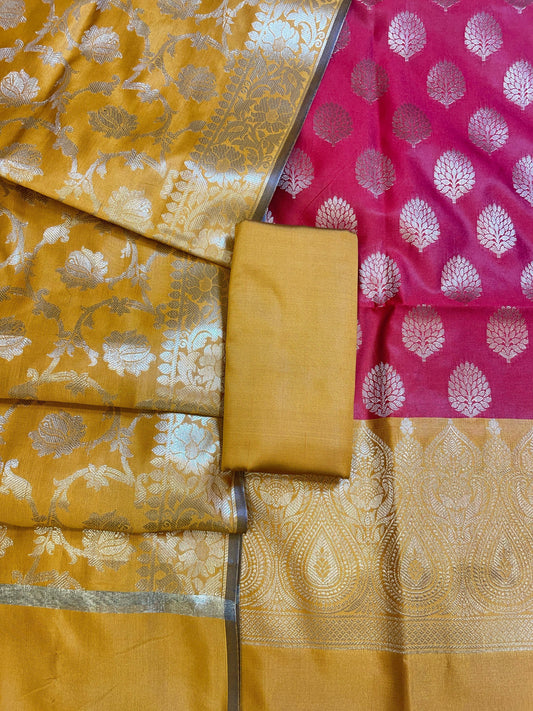 Mustard Gold Tissue Floral Stripe Zari Banarasi Suit Set With Crush Dupatta 1100SKL_TSU10