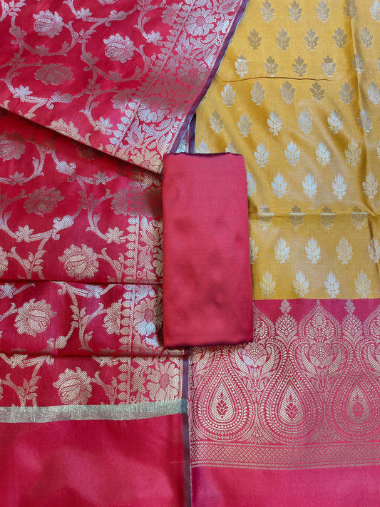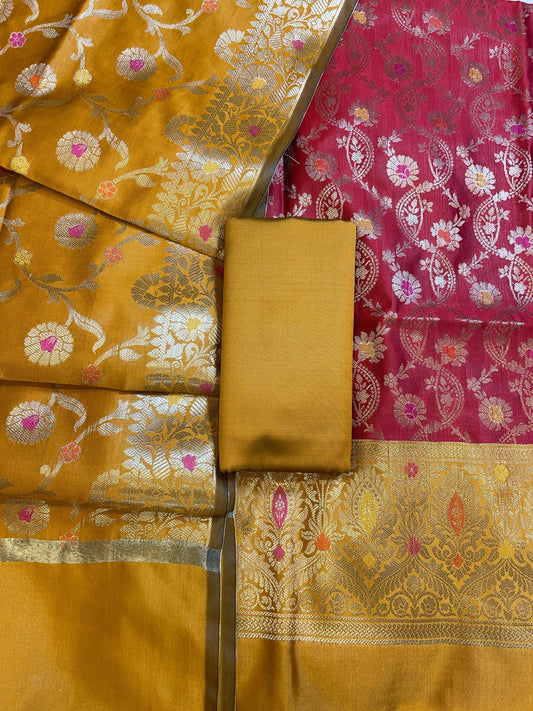 Mustard Art Silk Floral Zari Mina Jaal Contrast Banarasi Suit with Red Dupatta 625AJ_TPT16