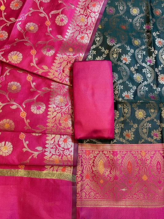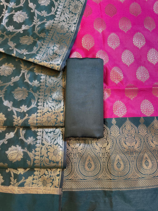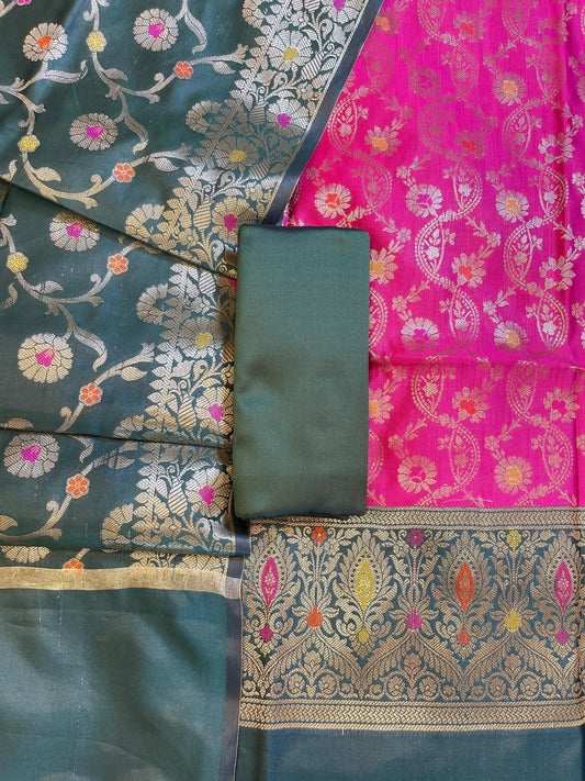 Darkgreen Art Silk Floral Zari Mina Jaal Contrast Banarasi Suit with Pink Dupatta 625AJ_TPT14