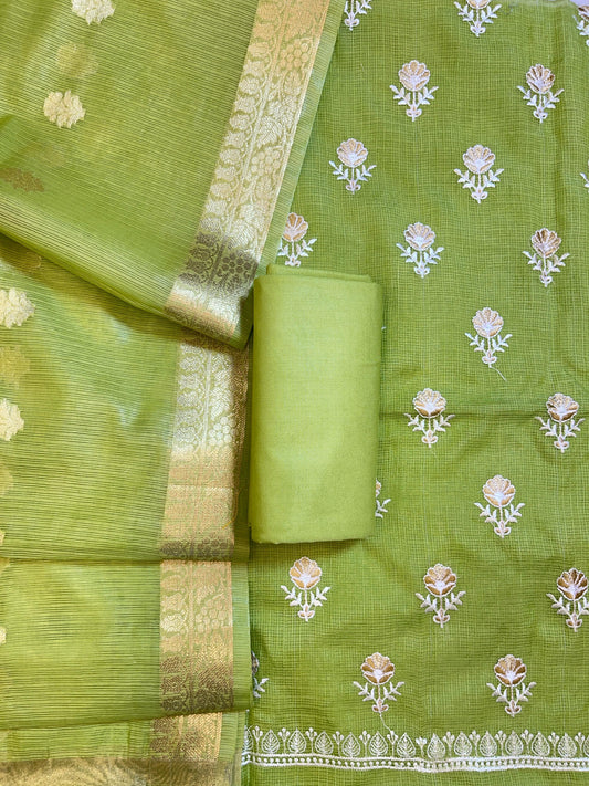 Light Green Kota Check Embroidery Banarasi 3 pcs Suit Set 1000SKL_KC1