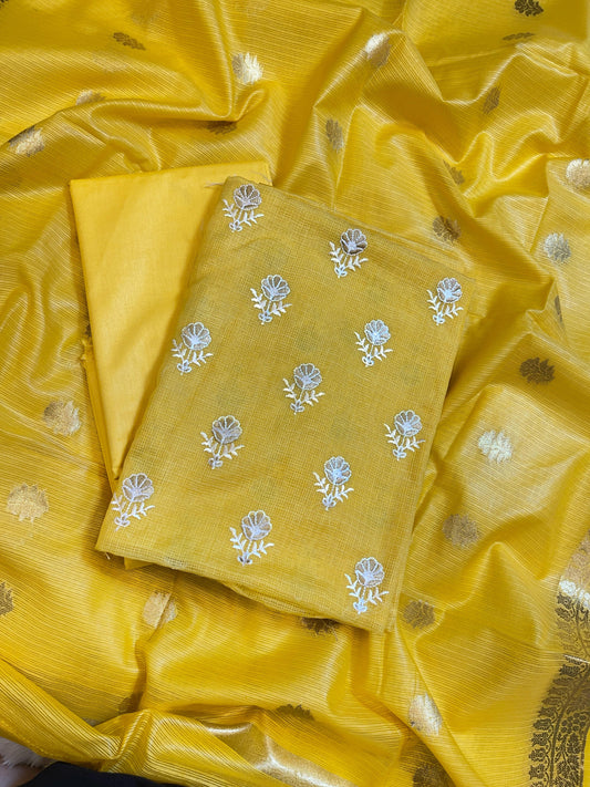 Yellow Kota Check Embroidery Banarasi 3 pcs Suit Set 1000SKL_KC3