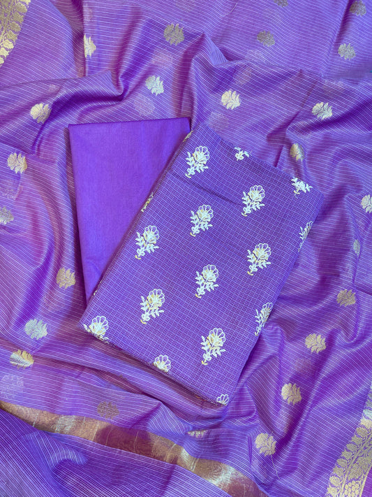 Purple Kota Check Embroidery Banarasi 3 pcs Suit Set 1000SKL_KC4
