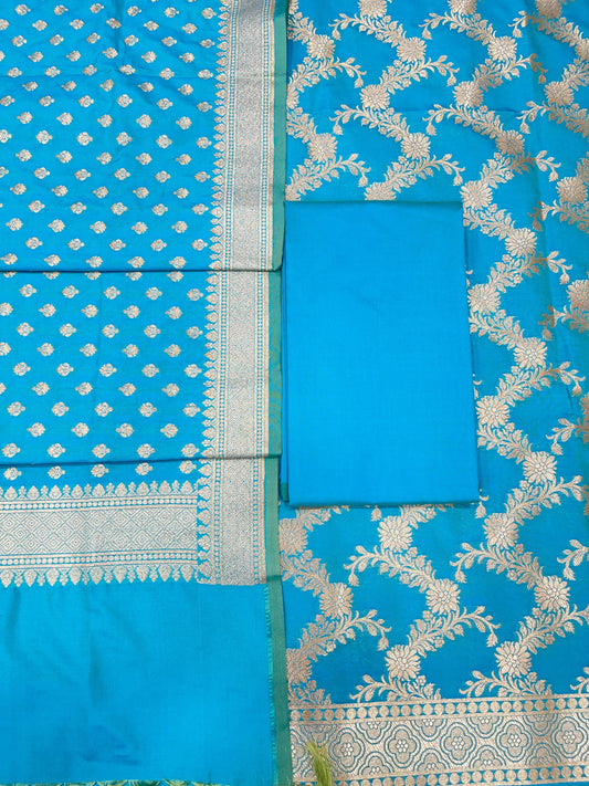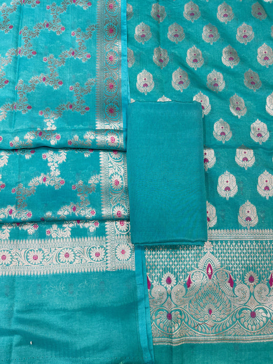 Puresilk Handloom Turquoise Blue Viscose Silk Banarasi 3 pcs Suit Set RHN_VS11