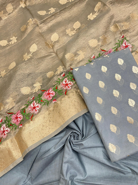 Blue Pure Cotton Embroidery Tissue Dupatta Banarasi 3 pcs Suit Set IM_PCEM2