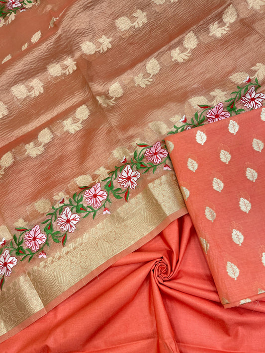 Orange Pure Cotton Embroidery Tissue Dupatta Banarasi 3 pcs Suit Set IM_PCEM3