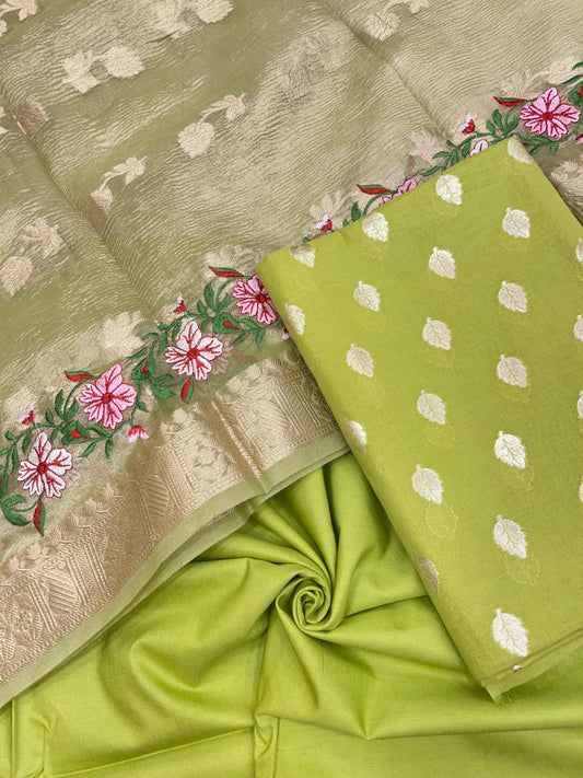 Light Green Pure Cotton Embroidery Tissue Dupatta Banarasi 3 pcs Suit Set IM_PCEM4