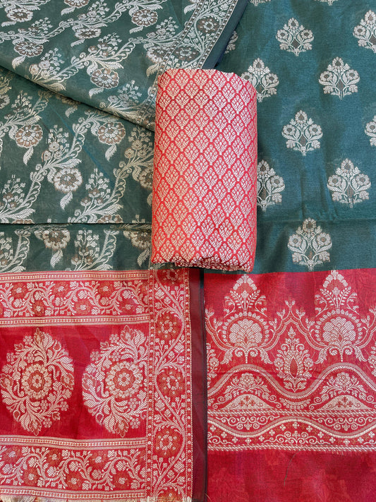 Darkgreen Cotton Floral Resham Booti Contrast Red Dupatta Banarasi Suit 600AJ_PJS14
