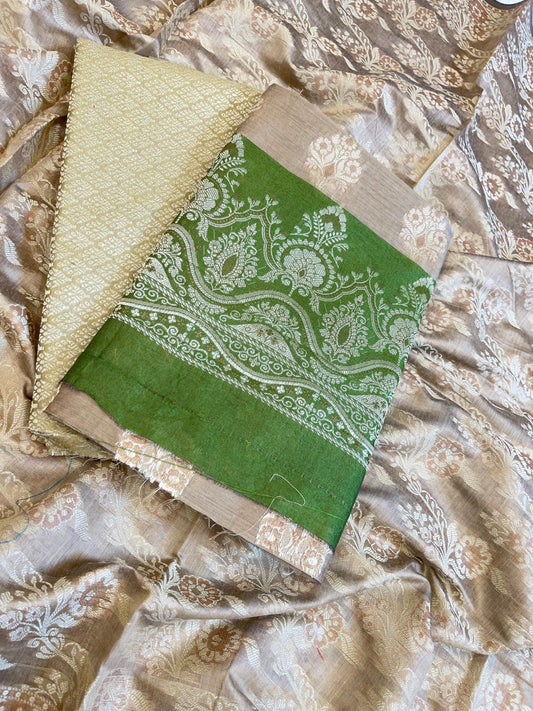 Beige Cotton Floral Resham Booti Contrast Green Dupatta Banarasi Suit 600AJ_PJS17