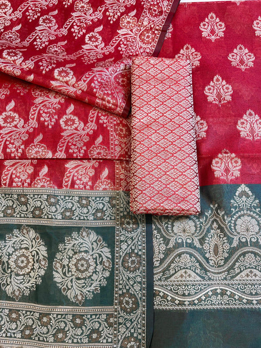 Red Cotton Floral Resham Booti Contrast Darkgreen Dupatta Banarasi Suit 600AJ_PJS15